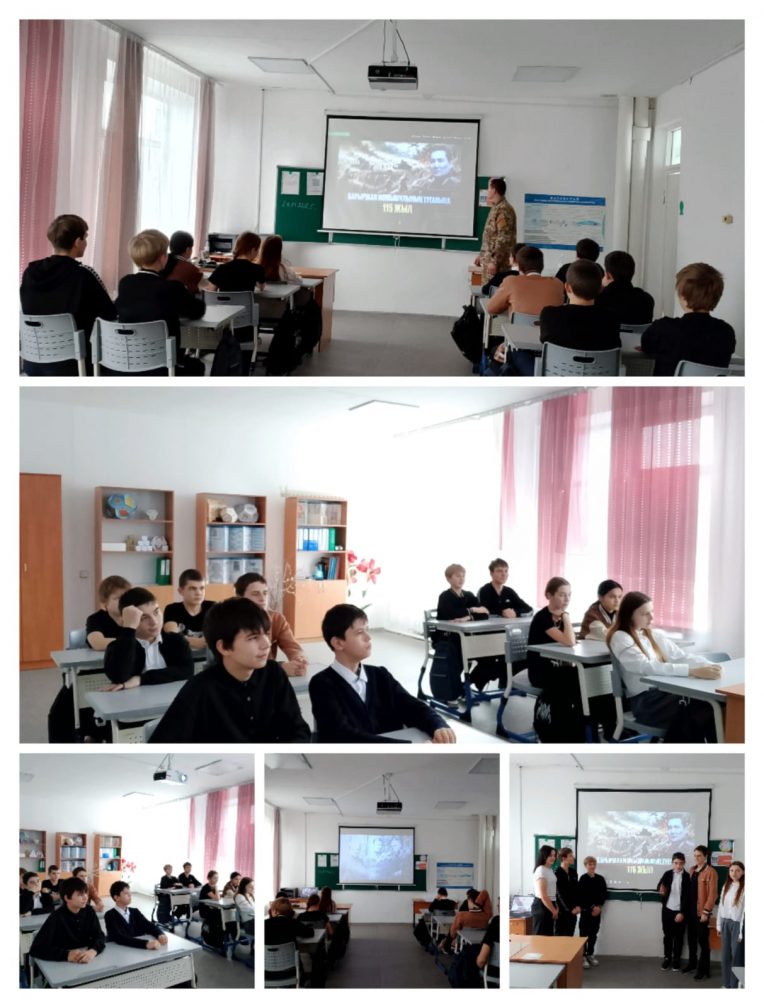 Әскери-патриоттық тәрбиені нығайту мақсатында мектепте Бауыржан Момышұлының өмірі мен ерлігі үлгісінде «Бауыржан Момышұлы - қазақ халқының ұлы перзенті, даңқты қолбасшы» тақырыбында ерлік сабағы өткізілді.