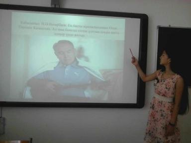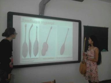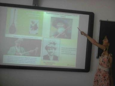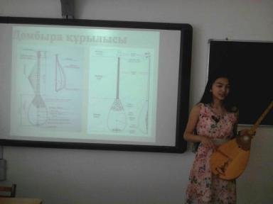 қазақ – Домбыра!», продемонстрировала презентацию, рассказав подробно историю домбры, легенду о происхождении инструмента, об устройстве домбры.